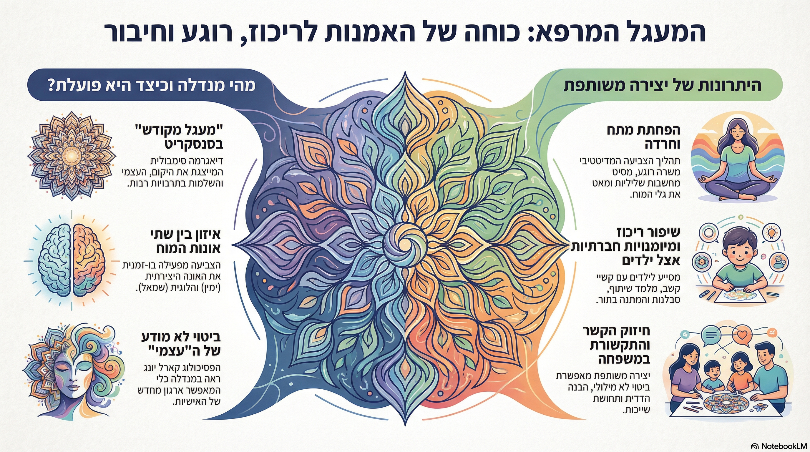כאשר כל בני המשפחה מתיישבים יחד לצבוע, נוצר מרחב שבו מתאפשר חיבור עמוק ברמה הלא-מילולית. כלומר: צביעת מנדלה משותפת יכולה לעודד מספר תהליכים דינמיים ובין-אישיים חיוניים: